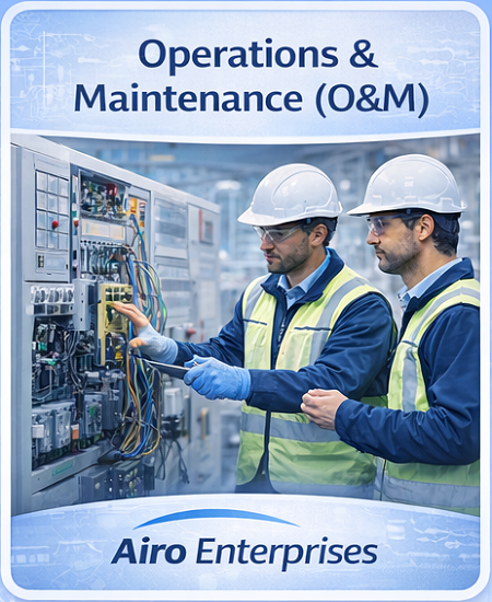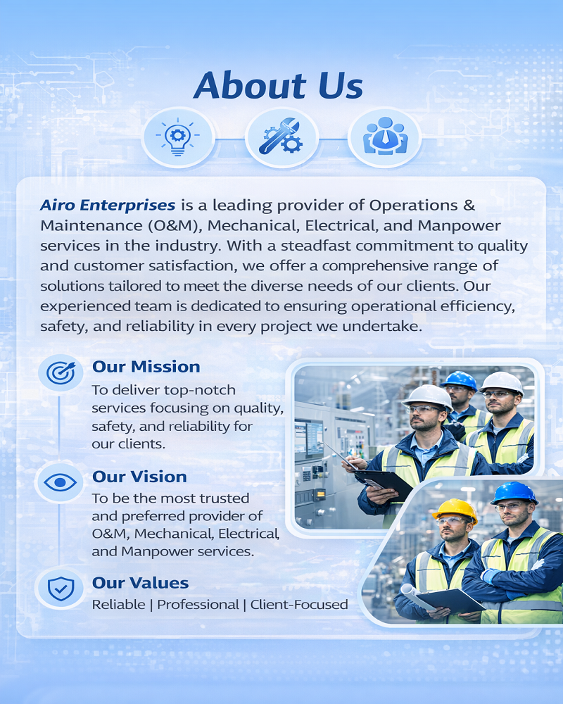 Airo Enterprises is a trusted service provider offering end-to-end solutions in Operations & Maintenance, Mechanical, Electrical, Project Execution, Housekeeping, and Manpower Supply. We deliver reliable, cost-effective, and quality-driven services across industrial and commercial sectors.